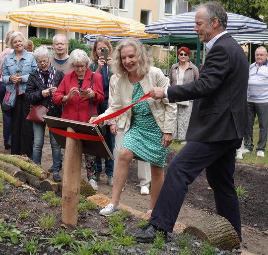 Wie bei vielen Naturgarten-Projekten der Stiftung für Mensch und Umwelt üblich, fand auch diesmal eine feierliche Einweihung mit den Projektbeteiligten und interessierten Bewohner*innen statt. Zur Begrüßung sprachen Dr. Corinna Hölzer und Cornelis Hemmer (Leiter der Stiftung für Mensch und Umwelt), Carla Kaiser (Vorstandsmitglied der Wohnungsbaugenossenschaft „Berolina“ eG) sowie Prof. Dr. Stefanie Hennecke (Leitung des Referates III B „Naturschutz, Landschaftsplanung & Forstwesen“, SenMVKU). Im Anschluss führten Mitarbeiter des Natur-garten-Teams durch den neuen PikoPark sowie zum nur wenige Gehminuten entfernten „Tritt-steinbiotop“. Damit gemeint ist hier ein Beetstreifen direkt am Wohnhaus, der – auf deutlich kleinerer Fläche – ebenfalls ökologisch aufgewertet wurde. Am Infostand der Stiftung für Mensch und Umwelt konnten sich Interessierte über den Sinn einer naturnahen Gestaltung informieren und bei einem Quiz ihr Wissen testen. „Wir freuen uns riesig, mit der ‚Berolina' eine weitere Genossenschaft an Bord zu haben. Naturnahes Grün zieht immer größere Kreise und wir möchten noch viele weitere Genossenschaften davon begeistern“, so die Stiftungsleitung. Dazu passt das positive Feedback, das die Stiftung von einem Anwohner erhielt.