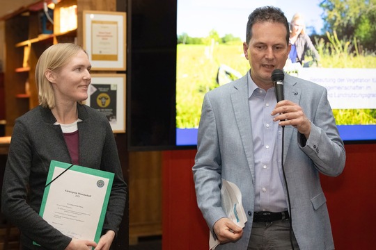 ![]() Claus Obermeier (r.), Vorstand der Gregor Louisoder Umweltstiftung, bei der Rede zum Förderpreis Wissenschaft für Dr. Cynthia Tobisch